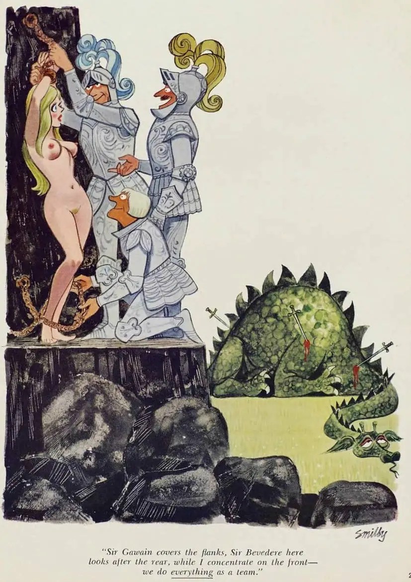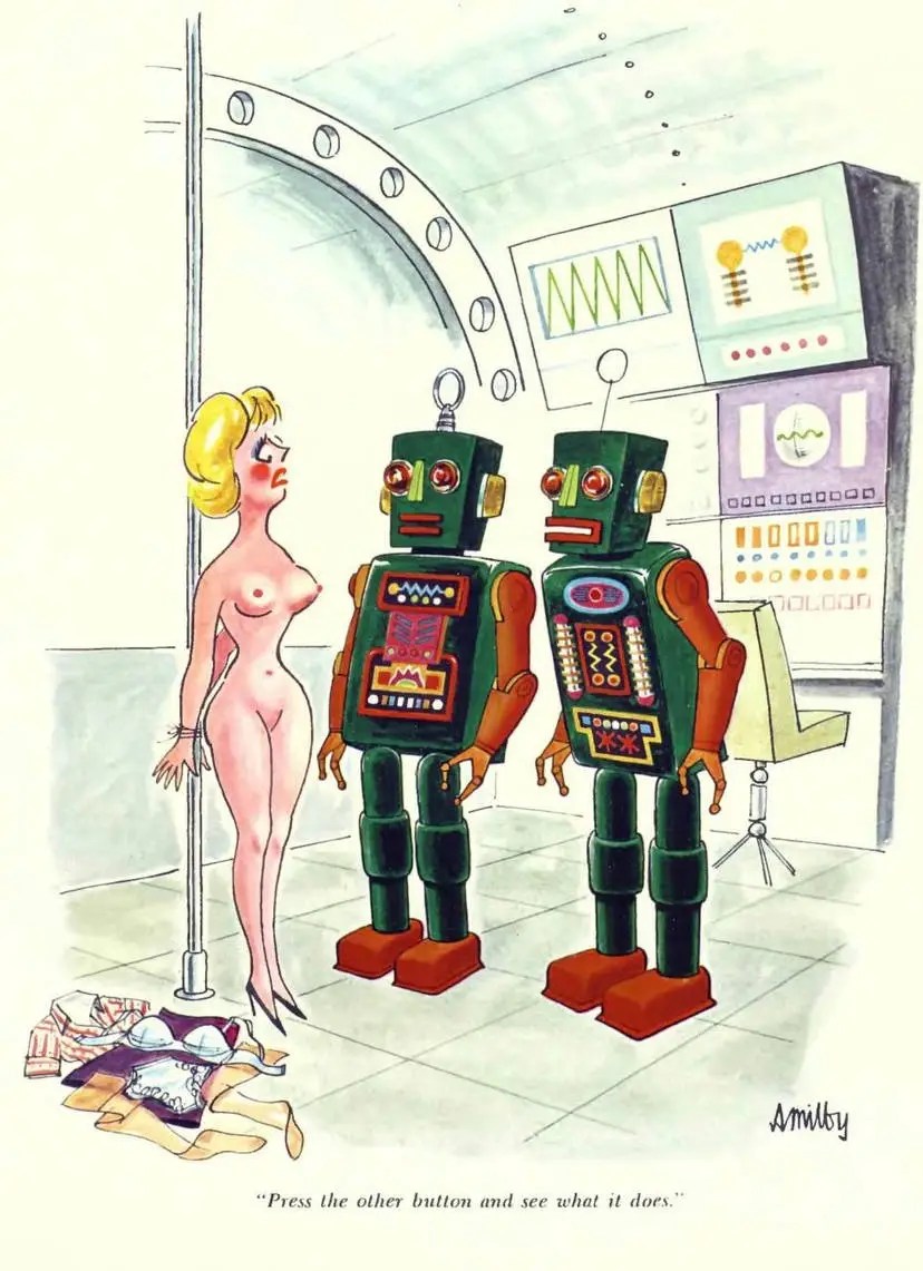 In de gloriejaren van Playboy (jaren ’60 tot ’80) tekenden artiesten als Erich Sokol, Gahan Wilson, Doug Sneyd, Eldon Dedini en Jack Cole full-page color cartoons die humor combineerden met lichte kinks. Ze waren vaak grappig, ironisch en een tikje provocerend, maar altijd met een knipoog. Denk aan situaties met touwen, zweepjes, dominante vrouwen of onderdanige mannen, verpakt in alledaagse scènes.