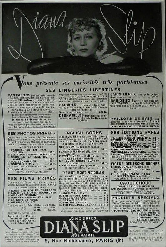 Lingeries libertines werd in 1939 gepubliceerd met 39 lingerie foto’s. Een uitgebreide verzameling is te vinden op de site Paris Olympia Press. La Belle Polissonne ou le Délicieux Écart werd in 1934 gepubliceerd, het is een erotisch verhaal waar foto’s aan toegevoegd werden. De foto’s komen uit de collectie van Diana Slip.